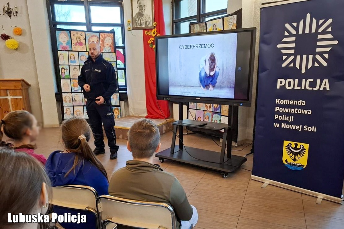 Mundurowi z Komendy Powiatowej Policji w Nowej Soli odwiedzają dzieci, by przypomnieć im o zasadach bezpieczeństwa i prawidłowych zachowaniach w różnych sytuacjach. W dzisiejszych czasach dzieci coraz chętniej sięgają po telefon czy komputer. Pamiętajmy, że to źródło wiedzy, rozrywki, ale i czyhających na dzieci zagrożeń. Działania profilaktyczne, które odbywają się w szkołach dotyczą cyberprzemocy wśród dzieci i młodzieży. Podczas zajęć policjanci omawiają aspekty prawne i wyjaśniają, kto może być świadkiem, ofiarą oraz sprawcą cyberprzemocy. Należy pamiętać o tym, że Internet, to nie tylko źródło informacji czy sposób na załatwienie ważnych dla nas spraw, ale również wiele pułapek. Podczas „czatowania” czeka na nas wiele ukrytych i niespodziewanych niebezpieczeństw. Lekcja profilaktyki, której głównym aspektem jest bezpieczeństwo, jest każdego roku przeprowadzana przez nowosolskich funkcjonariuszy. Policjanci przekazują dzieciom, zarówno tym starszym, jak i tym młodszym, jak reagować w sytuacjach zagrożenia i do kogo zwrócić się o pomoc. Mówią również o pracy funkcjonariuszy, aby dzieci wiedziały, że rolą policjanta jest nie tylko zatrzymywanie przestępców, ale także udzielanie pomocy, w tym również dzieciom. Aby uchronić się przed niebezpieczeństwem i jego negatywnymi następstwami, warto przypomnieć sobie, czego należy się wystrzegać w Internecie i na co zwracać szczególną uwagę, aby być bezpiecznym. Mundurowi opowiadają również o bezpieczeństwie w cyberprzestrzeni. Często przeglądane przez młodych ludzi treści są nieadekwatne do ich wieku, a co więcej mogą wpływać niekorzystnie na ich psychikę i zachowanie. Ważną rolę w procesie uświadamiania najmłodszych odgrywają rodzice. To oni, jako pierwsi powinni poinformować swoje pociechy o możliwych zagrożeniach.
