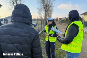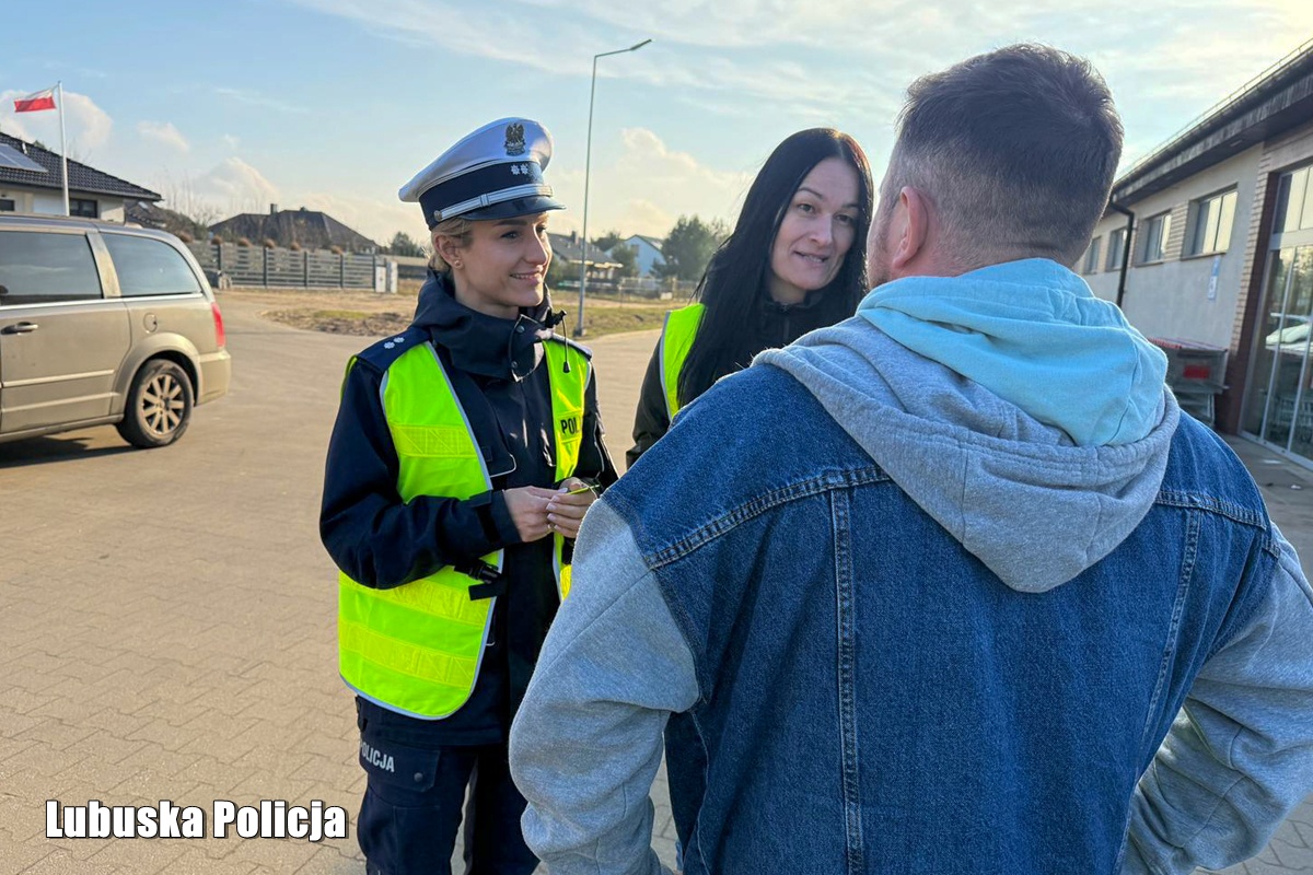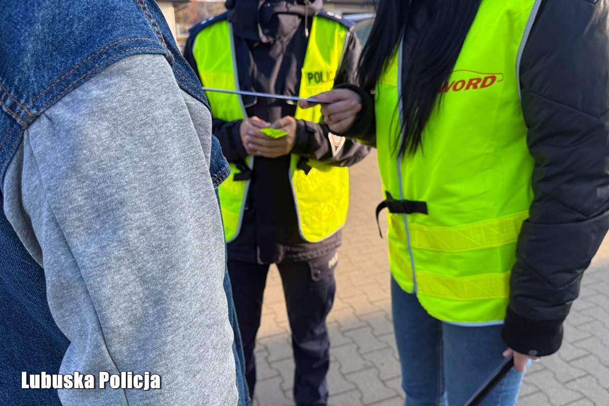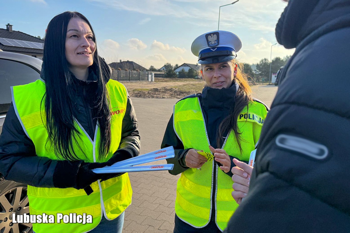 Podczas sezonu jesienno – zimowego, funkcjonariusze szczególną troską obejmują osoby piesze. Dlaczego? Szybko zapadający zmrok oraz niesprzyjające warunki atmosferyczne, takie jak opady deszczu, śniegu czy też mgła znacznie ograniczają widoczność osób pieszych. Bardzo istotnym jest, aby nieustannie edukować wszystkie grupy wiekowe na temat nieocenionej roli elementów odblaskowych. Jak pokazuje praktyka, kierowca jest w stanie dostrzec pieszego wyposażonego w świecącą opaskę lub zawieszkę nawet z odległości 150 metrów, z kolei przy braku takiego elementu, dopiero przy około 30 metrach. Różnica jest ogromna, prawda? Każdy dodatkowy metr, to czas na dostosowanie się do sytuacji drogowej, a co najważniejsze na reakcję. Czy w takim układzie odblask może uratować życie? JASNE, że tak! W minionych dniach mundurowi Wydziału Ruchu Drogowego Komendy Wojewódzkiej Policji w Gorzowie Wielkopolskim oraz przedstawiciele Wojewódzkiego Ośrodka Ruchu Drogowego w Gorzowie Wielkopolskim, po raz kolejny połączyli swoje siły na rzecz bezpieczeństwa. Tym razem jednak z miasta przenieśli się na obszary wiejskie, aby wieść o wielkiej mocy świecących elementów niosła się jak najszerzej. Napotkanym pieszym wręczali odblaskowe opaski i zawieszki, edukując przy tym o ich znaczeniu dla widoczności na drodze. Co bardzo cieszy, nasza inicjatywa spotkała się z bardzo pozytywnym przyjęciem. Rozmówcy chętnie dzielili się swoimi doświadczeniami zarówno w roli osoby pieszej, jak i kierowcy.