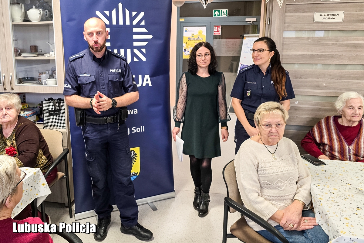 Policjanci z Komendy Powiatowej Policji w Nowej Soli cyklicznie organizują debaty społeczne w całym powiecie nowosolskim. Tym razem policjantom towarzyszyła radczyni prawna, która również omówiła zasady bezpiecznego poruszania się w przestrzeni wirtualnej, aby nie narażać się na niebezpieczeństwa czyhające w sieci. Funkcjonariusze szczegółowo omówili pojęcie bezpieczeństwa seniorów, przedstawiając sposób działania przestępców. Celem debaty jest wymiana informacji pomiędzy Policją a seniorami w zakresie lokalnych inicjatyw na rzecz poprawy ich bezpieczeństwa. Podczas spotkania policjanci wyjaśniają zasady, których należy przestrzegać, aby nie stać się ofiarą oszustów. Niestety, pomimo licznych apeli ze strony Policji, nadal osoby w podeszłym wieku stają się ofiarami oszustów. Ponownie zwracamy się z prośbą o ostrożność i rozwagę w kontaktach z nieznajomymi. Zachęcamy, aby uczulić swoją rodzinę i znajomych na to, by zawsze stosowali zasadę ograniczonego zaufania. Ofiarami oszustwa padają głównie ludzie starsi, których wrażliwość i ufność wykorzystują przestępcy. Dla nich ten nielegalny proceder stał się głównym źródłem dochodu, więc stale wymyślają nowe metody oszustw. Przy tego typu przestępstwach bardzo ważną rolę odgrywa profilaktyka, której głównym celem jest uświadomienie osób starszych przed grożącym im niebezpieczeństwem ze strony oszustów.