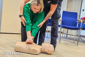 W środę (10 grudnia) w Komendzie Powiatowej Policji w Krośnie Odrzańskim odbyło się szkolenie z pierwszej pomocy przedmedycznej zorganizowane dla pracownic cywilnych, z okazji 100-lecia kobiet w Policji. Szkolenie przeprowadziła dzielnicowa gminy Gubin młodsza aspirant Sylwia Hajdamowicz, która posiada uprawnienia do udzielania kwalifikowanej pomocy przedmedycznej jako ratownik. Policjantka w trakcie zajęć omówiła i pokazała między innymi jak tamować krwawienia, zabezpieczać rany i krwotoki, co robić przy poparzeniu, zadławieniu lub zakrztuszeniu. Nadto pokazała jak zabezpieczać kończyny przy złamaniu, jak prowadzić resuscytację krążeniowo – oddechową oraz omówiła w jakich sytuacjach i jak użyć AED. Panie chętnie uczestniczyły w zajęciach i ćwiczyły udzielanie pierwszej pomocy, dzięki czemu utrwaliły praktyczne umiejętności niezbędne w sytuacjach zagrożenia życia i zdrowia.