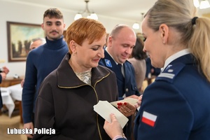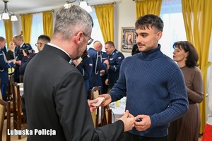 Po zakończeniu mszy zebrani goście oraz funkcjonariusze udali się na tradycyjne spotkanie opłatkowe. Rozpoczął je Komendant Wojewódzki Policji w Gorzowie Wielkopolskim, inspektor Jerzy Czebreszuk, który podkreślił, jak istotne są te chwile, wynikające z potrzeby serca. Zaznaczył również, że pamięć o tych, którzy oddali życie na służbie, jest stale żywa. Komendant podziękował także nieobecnej na uroczystości młodszej inspektor w stanie spoczynku Irenie Zając - prezes Fundacji Pomocy Wdowom i Sierotom po Poległych Policjantach, doceniając jej pracę i zaangażowanie. Na koniec złożył wszystkim obecnym życzenia świąteczne, pełne pokoju, miłości i dobrych wspomnień. Następnie zgromadzeni przełamali się opłatkiem, składając sobie wzajemnie bożonarodzeniowe życzenia. Komendant wręczył rodzinom upominki świąteczne, ufundowane przez Fundację Pomocy Wdowom i Sierotom po Poległych Policjantach.