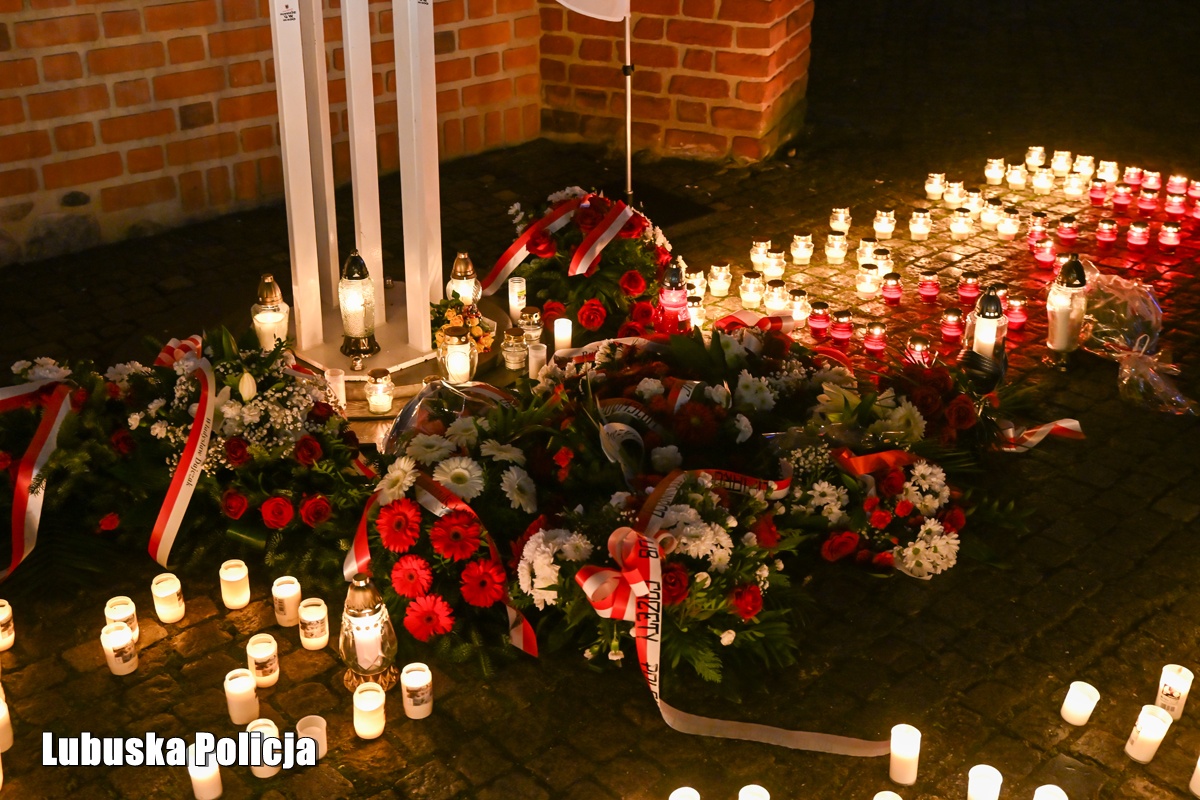 Data 13 grudnia na stałe zapisała się w polskiej historii jako symbol zniewolenia, ale i niezłomnej walki o godność człowieka. Dokładnie 44 lata temu, mroźnego niedzielnego poranka, władze komunistyczne wypowiedziały wojnę własnemu narodowi. Wprowadzenie stanu wojennego, połączone z zawieszeniem praw obywatelskich, cenzurą, godziną milicyjną oraz masowymi internowaniami, miało na celu stłumienie rodzącej się nadziei na wolność. Był to czas dramatycznych wyborów, represji i ofiar, o których pamięć jest naszym moralnym obowiązkiem. W dzisiejszych uroczystościach upamiętniających ten bolesny rozdział naszej historii udział wzięli przedstawiciele władz państwowych i samorządowych, duchowieństwa oraz licznie zgromadzeni mieszkańcy regionu. Lubuskich stróży prawa reprezentował Komendant Wojewódzki Policji w Gorzowie Wielkopolskim, inspektor Jerzy Czebreszuk.
