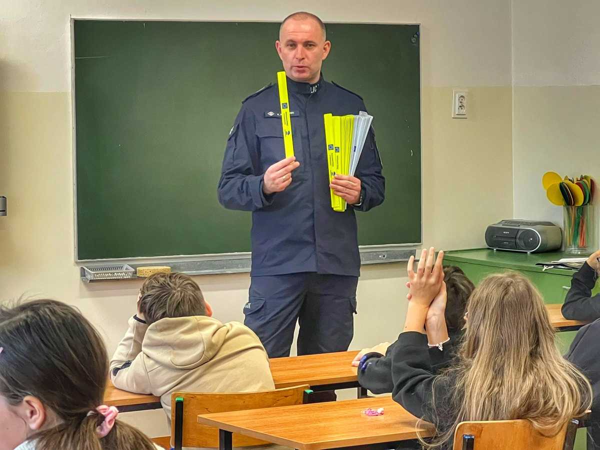 Miłym i praktycznym akcentem spotkania było wręczenie dzieciom odblasków, przekazanych przez Stowarzyszenie „Bezpieczne Miasto”. Dzięki nim uczniowie będą lepiej widoczni na drodze, szczególnie zimą, gdy szybko zapada zmrok. To drobny gadżet, który może uratować zdrowie, a nawet życie.
