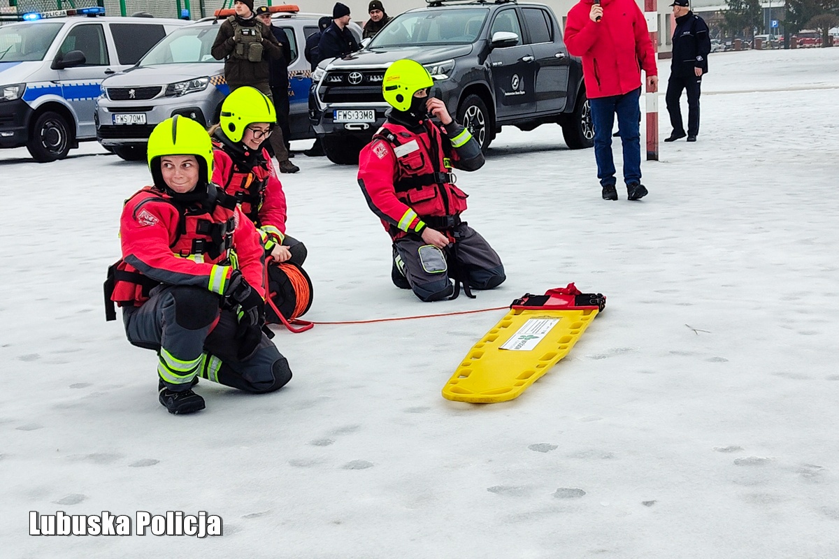 Na zakończenie wizyty służb ratownicy WOPR zainscenizowali działania ratownicze polegające na podejmowaniu poszkodowanego z zamarzniętego akwenu. Wszystkim służbom, które wsparły nas w tym przedsięwzięciu serdecznie dziękujemy.