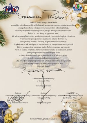 Dodano: 24.12.2025 - Życzenia Komendanta Wojewódzkiego Policji w Gorzowie Wielkopolskim z okazji Świąt Bożego Narodzenia Dodano: 23.12.2025